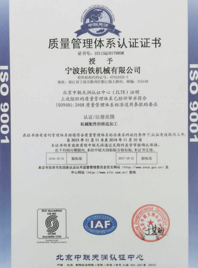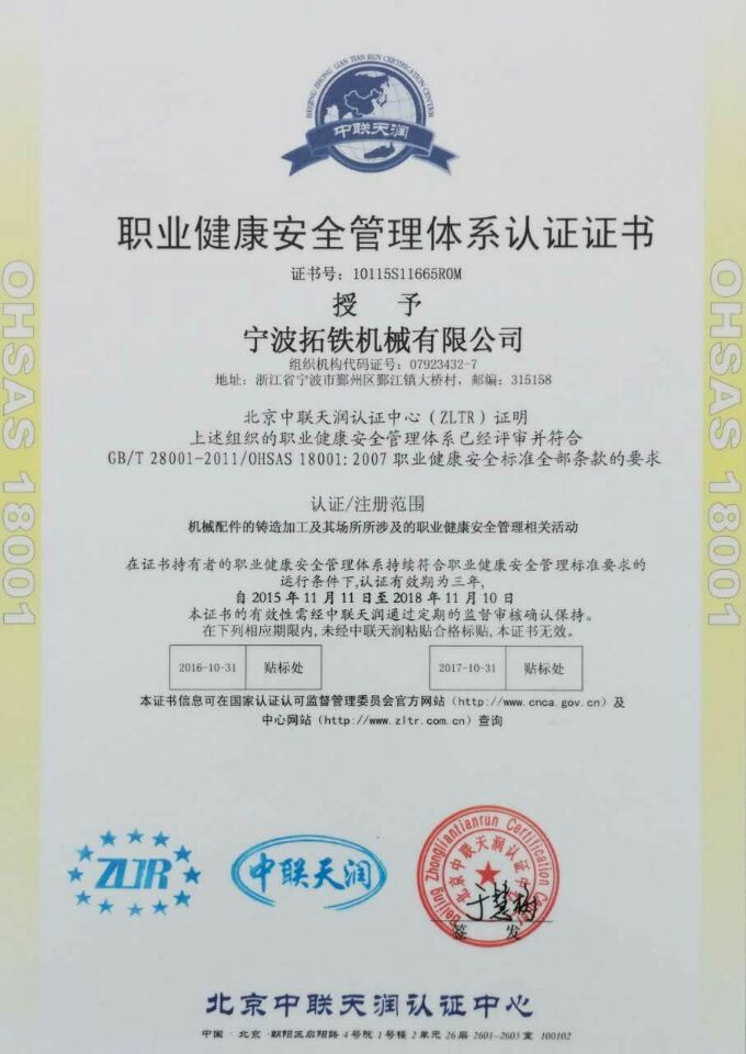 2015年11月,皇冠(中国)机械获得国家ISO9001质量管理体系认证,ISO14001环境管理体系认证和OHSAS18001职业健康安全管理体系认证。
